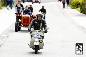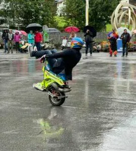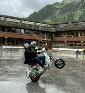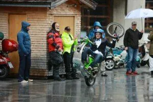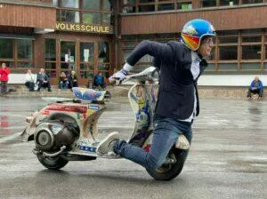 Am Samstag Nachmittag folgte dann ein weiterer Höhepunkt. Leider im strömenden Regen sorgte Nicola mit „heißer“ Vespa Akrobatik für „qualemenden“ Asphalt. In seiner Show machte Nicola all dass, was wir uns auf unseren Vespas nicht zutrauen.